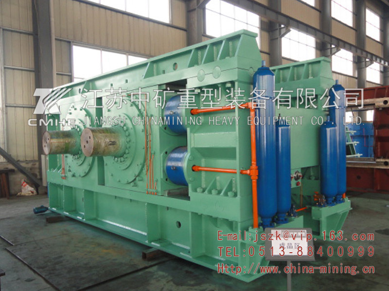 輥壓機由機架、兩個輥系、傳動裝置、扭矩支承、輥罩、進料裝置、液壓(加壓)系統(tǒng)、主軸承潤滑系統(tǒng)、干油潤滑系統(tǒng)、電氣系統(tǒng)等部份組成。