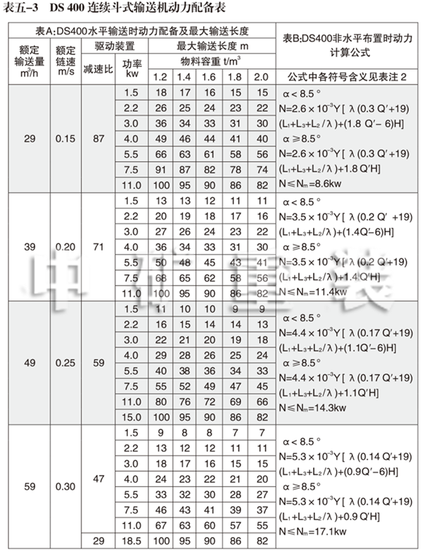 1、DS 400連續斗式輸送機動力配備表