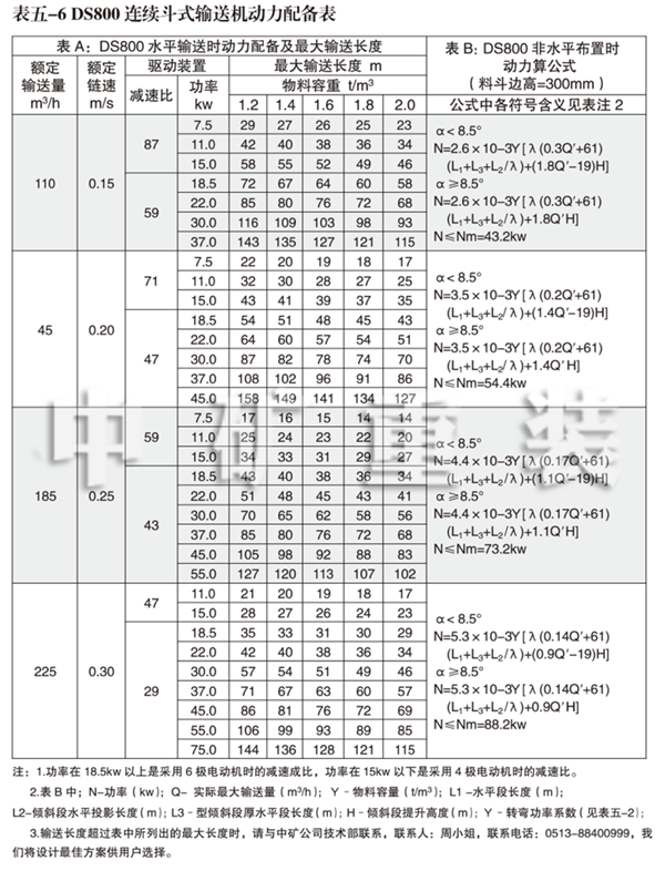 DS型連續斗式輸送機動力配備表
